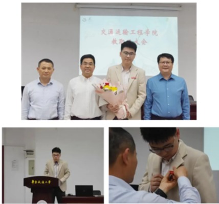 新教师马俊驰进行自我介绍,表达自己对奉献学院的渴望。接着,副经理张志坚为新教师别戴校徽,赠送鲜花,学院领导与新入职教师合影留恋。最后,党委书记丁锋贵为新教师入职表示欢迎和祝贺并以“华交人”三个字赠言,为新教师寄语。