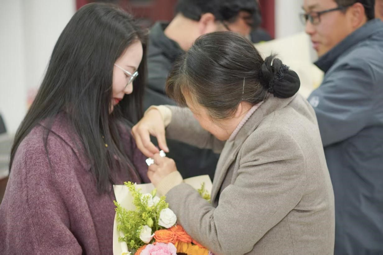 会议最后,学院为新入职的张智、陈胜利、李倩三位老师举行了入职仪式。三位老师分别上台发言,表达了他们对未来工作的期待与决心。副经理石俊刚、甘卫华为新进教师佩戴校徽并送上鲜花,勉励他们立足岗位、扎根教育事业。