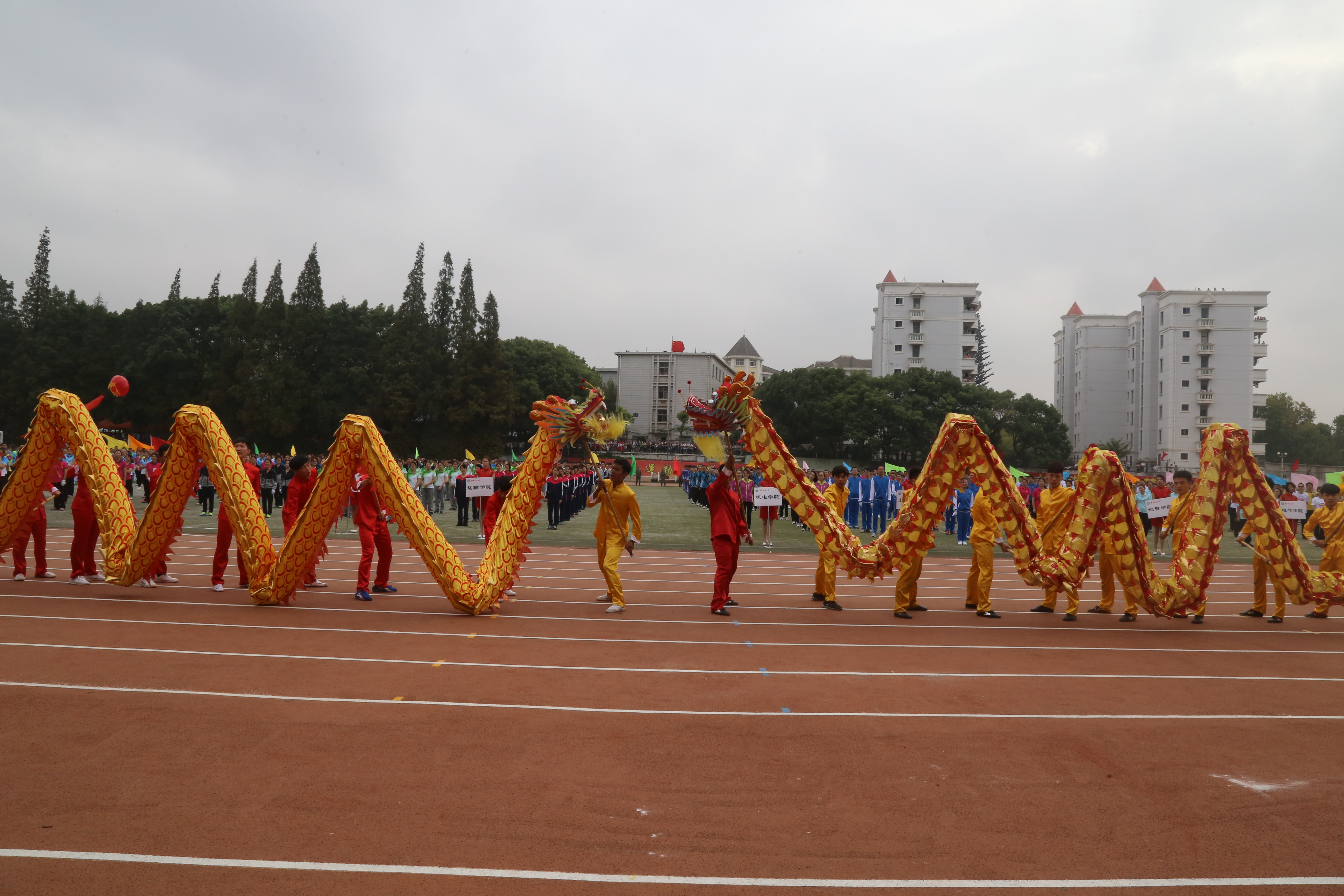 随后,在各学院方阵队进行广播体操表演及舞龙队伍表演。